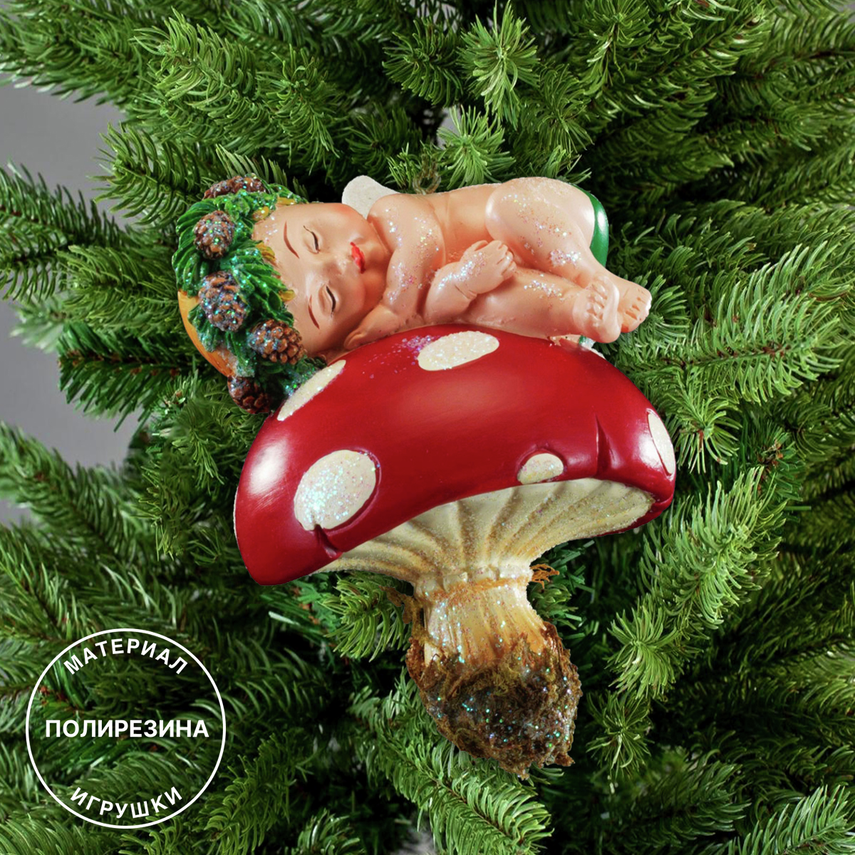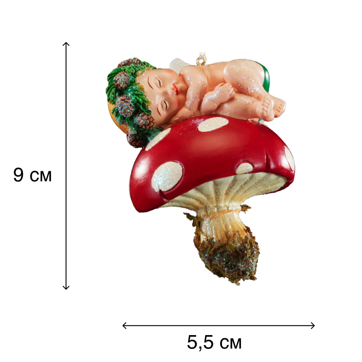 Трогательное украшение представляет собой маленького ангела, спящего на мухоморе. Изделие является относительно тяжелым, предпочтительно использование на искусственной елке. Групповая упаковка предназначена только для безопасной транспортировки и хранения.