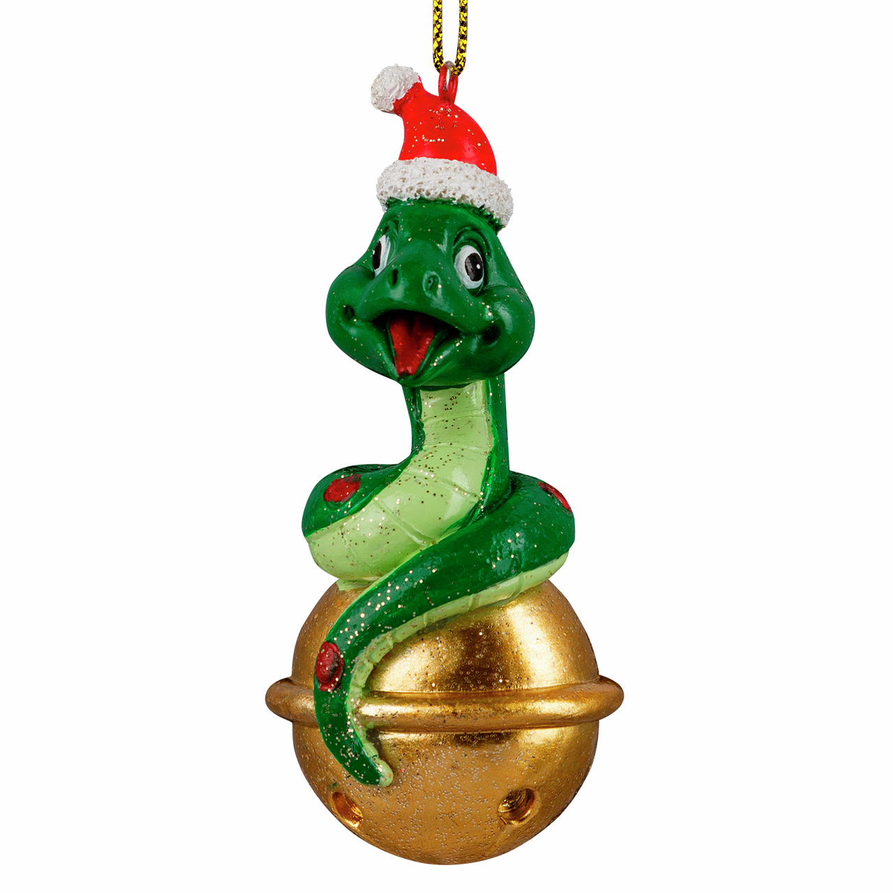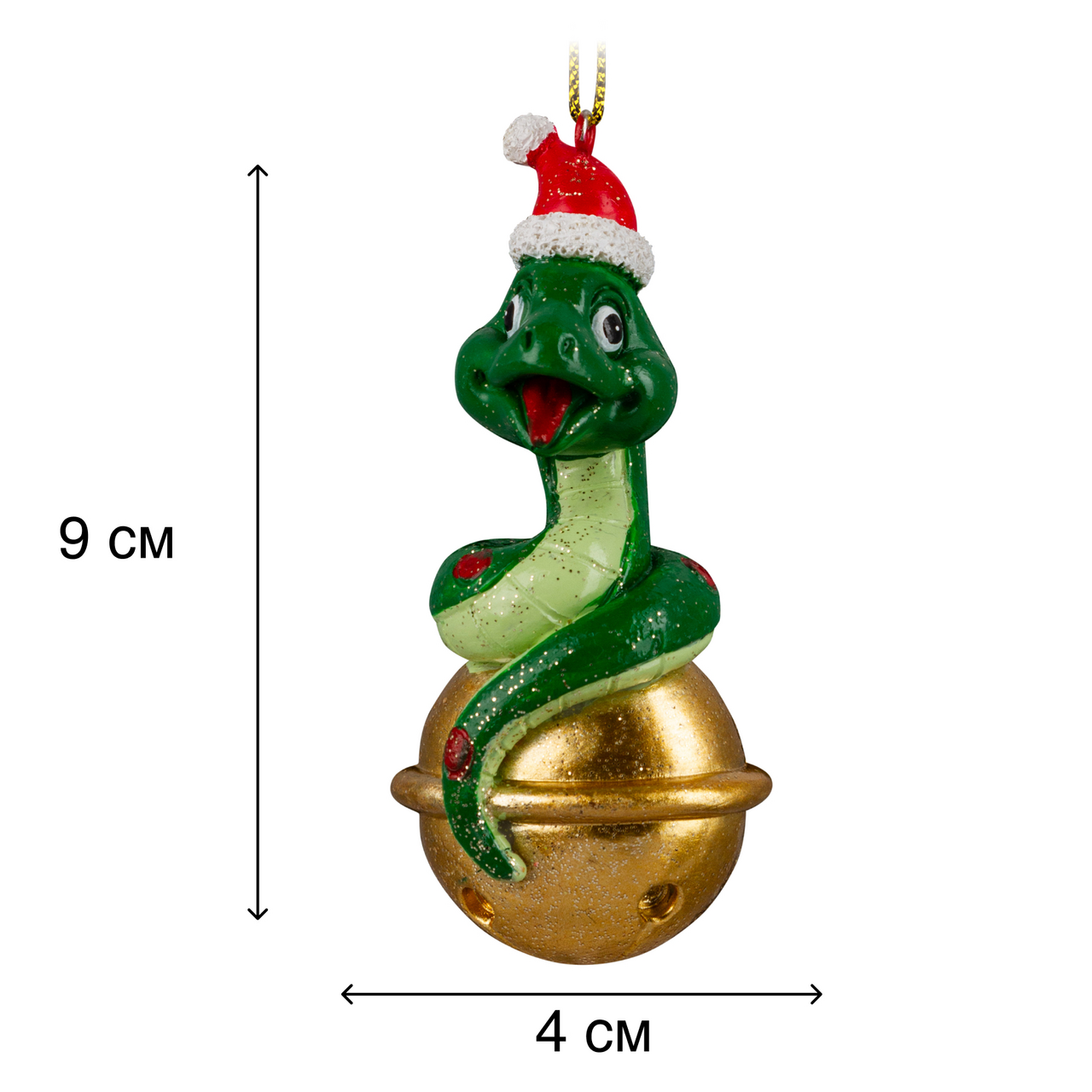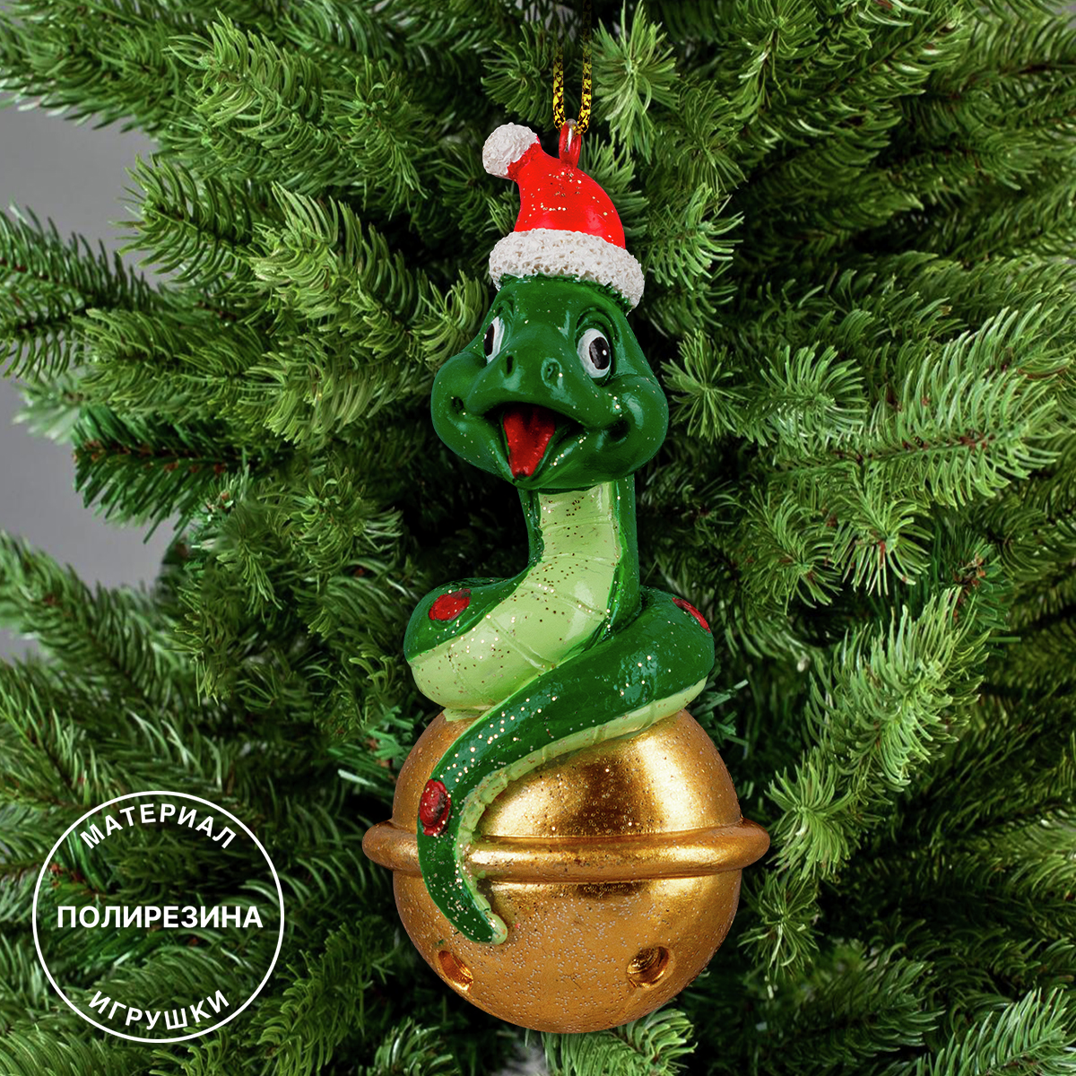 Змея - Символ 2025 года. Задорная змейка сидит на золотом елочном шаре. Яркий персонаж принесет удачу своим хозяевам в Новом году. Детали украшения подчеркнуты сверкающими золотыми блестками. Групповая упаковка предназначена только для безопасной транспортировки и хранения.