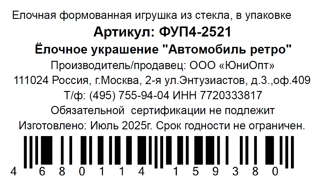 Украшение елочное Коломеев Автомобиль ретро, 6см