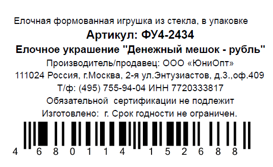 Украшение елочное Коломеев Мешок рубль, 10см
