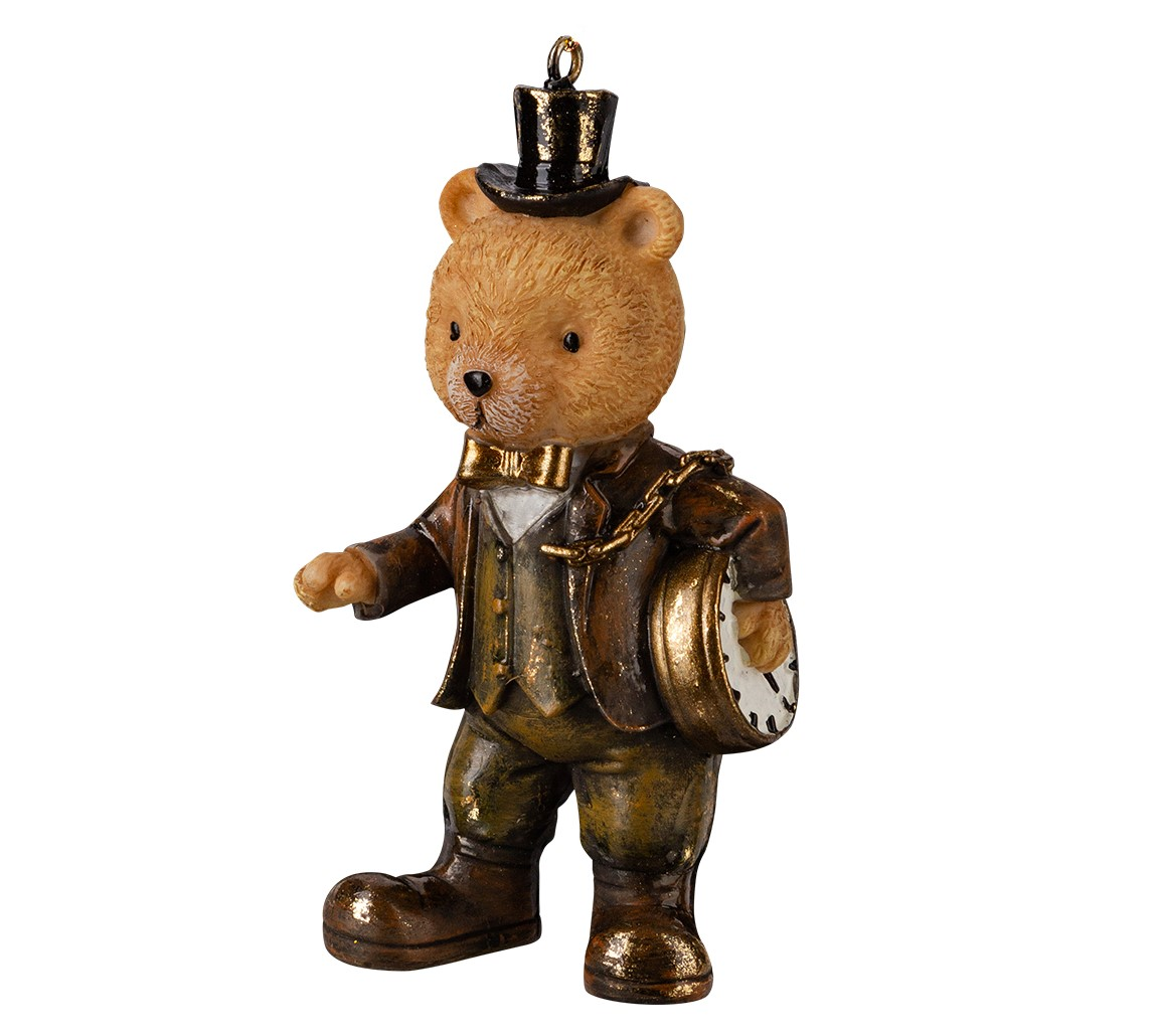Стильный медвежонок одет с иголочки. Костюм персонажа отличается особой элегантностью. Карманные часы являются изюминкой наряда - этот стильный аксессуар хранит дух ушедшей эпохи, добавляя образу нотку винтажности. Галстук-бабочка и часы покрыты сверкающей золотой краской. Изделие является относительно тяжелым, предпочтительно использование на искусственной елке или в качестве сувенира.