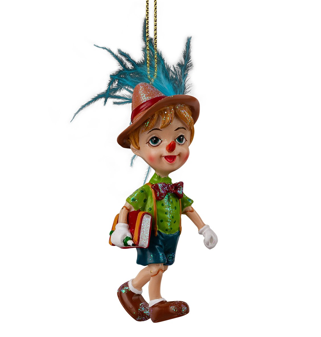Сказочные персонажи красиво смотрятся на елке, создавая уютную атмосферу дома. Пиноккио отличается искусно выполненными деталями - его руки и ноги на шарнирах идеально прорисованы. Персонаж одет в костюм ярких цветов. Шляпа украшена цветным перышком.