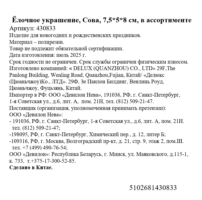 Украшение елочное Сова, 7.5 x 5 x 8см
