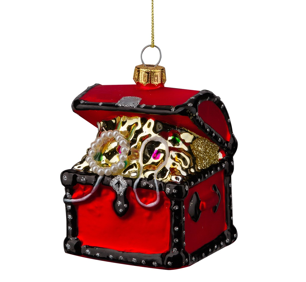 Сундук, полный несметных богатств, станет ярким акцентом на праздничной елке. Сверкающие краски и жемчужные бусы добавляют атмосферу волшебства. Драгоценные камни и золото тщательно прорисованы и словно оживают на свету. Украшение выполнено из стекла высокого качества.