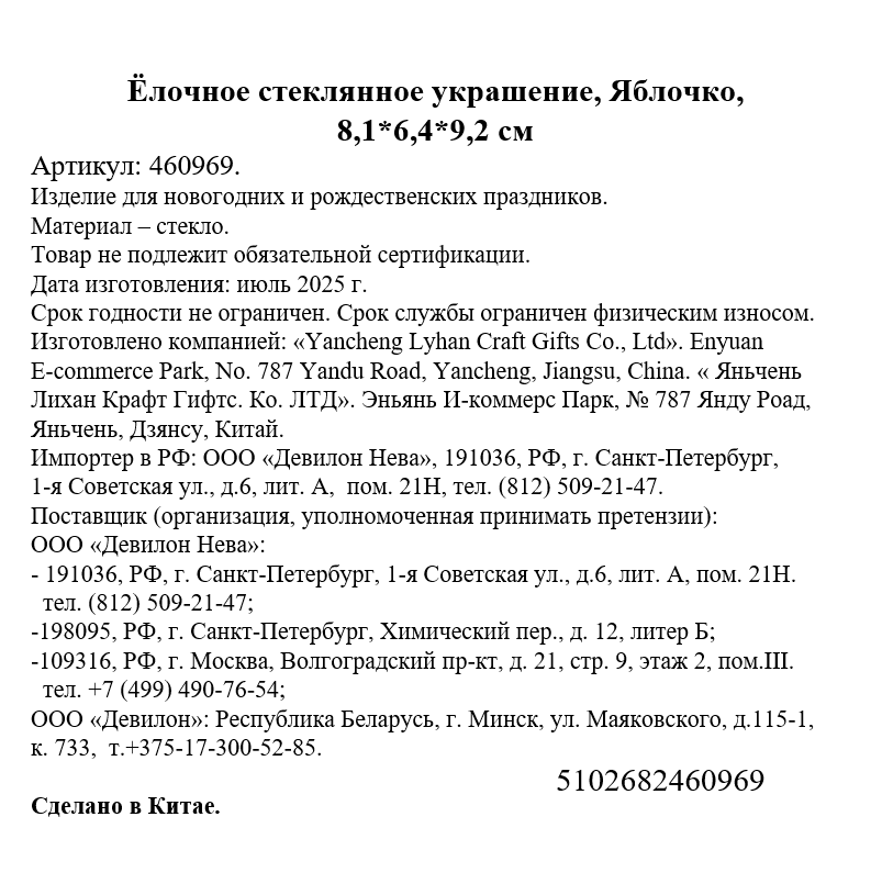 Украшение елочное Яблочко, 8.1 x 6.4 x 9.2см