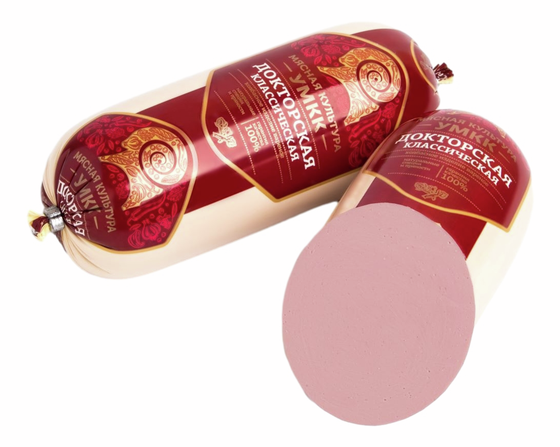 Колбаса Докторская изготовлена из охлажденного мяса. Продукт можно использовать для приготовления бутербродов и салатов. Упакована в фольгированный пакет. В составе только свинина и говядина.