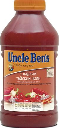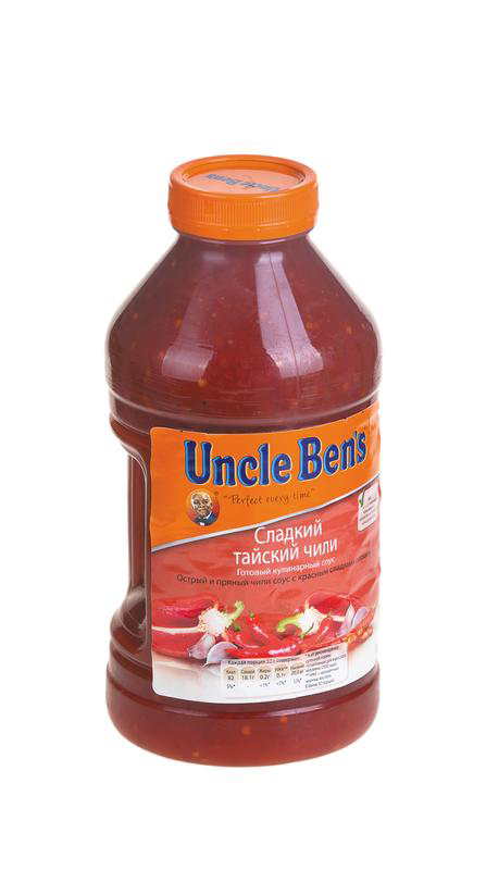 Соус UNCLE BEN'S Сладкий Тайский Чили – традиционный острый тайский соус, используемый для приготовления классических блюд восточной кухни.Состав : вода, сахар, фруктово-глюкозный сироп, паста чили (перец, чили, соль), уксус, загустители (модифицированный кукурузный крахмал, пектин), красный сладкий перец, чесночная паста, стабилизатор (ксантановая камедь), натуральный экстракт паприки, подсолнечное масло, уплотнитель (хлорид кальция). Масса нетто: 2,54 кг. Пищевая ценность (100 г /на порцию (50 г): Белки – 0,4 г/ 0,2 г, Углеводы – 38,7 г/19,4 г, из них сахаров – 36,2 г/ 18,1 г, Жиры – 0,4 г/ 0,2 г, из них насыщенных – 0,1 г/ 0,1 г, Пищевые волокна – 0,8 г/ 0,4 г, Натрий – 0,59 г/ 0,29 г, Соль – 1,50 г/ 0,74 г. Энергетическая ценность: 164 Ккал/82 Ккал. Состав короба: 2шт.
