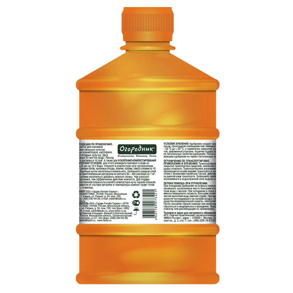 Ускоритель компостирования Фаско представляет собой жидкое средство для ухода за огородом. Данный продукт позволяет получить качественный компост без лишних затрат времени и ресурсов. Он подойдет для подкормки всех видов культур – овощных, плодовых, ягодных и декоративно-цветочных. Уникальная формула ускорителя обеспечивает равномерное распределение питательных веществ в почве. В его состав входят азот (NH4+NO3) 0,9%, фосфор (P2O5) 0,6%, калий (K2O) 1,5% и органическое вещество – не менее 3%. Поэтому продукт не только ускоряет процесс компостирования, но и обогащает почву необходимыми микроэлементами, способствуя здоровому росту и развитию всех видов культур на вашем участке. Покупая всего 600 мл ускорителя Фаско, вы получаете возможность создать компост, которого хватит для удобрения 6 соток огорода. Такой высокий уровень эффективности позволяет вам получить максимальное количество продукта с минимальными затратами. Немаловажным фактором является то, что ускоритель Фаско не содержит хлор, что делает его безопасным и экологичным выбором. Вы можете использовать любые органические остатки в процессе компостирования, не беспокоясь о негативном воздействии на окружающую среду. Фаско – ваш надежный помощник в создании плодородной почвы.