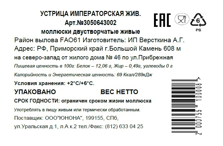 Диетический белковый продукт, богатый жирными кислотами Омега-3. Тонизирует нервную систему. Устрицы имеют нежный морской вкус, отдаленно напоминающий мясо гребешка. Вес одного моллюска составляет от 60 до 350г (от 3 до 12 устриц в 1кг), длина – от 10 до 20см. Благодаря узким раковинам приплюснутой формы устриц легко вскрывать.