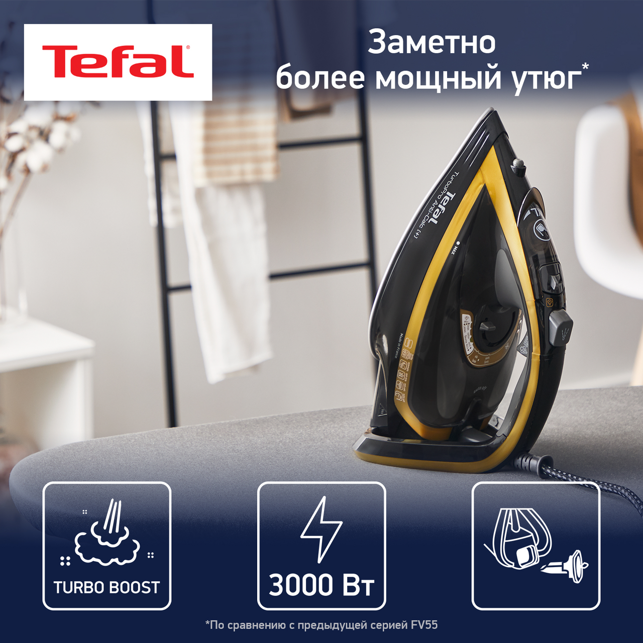 Утюг Tefal Turbo Pro Anti-Calc FV5696E1 выпускается в черном цвете корпуса с золотистыми вставками. Потребляемая мощность – 3000 Вт. Подошва Durilium Airglide изготавливается из металлокерамики. Этот материал отлично скользит по одежде, за ним просто ухаживать – все загрязнения легко удаляются. Предусмотрен резервуар для воды объемом 300 мл. Для разглаживания очень плотных тканей используется функция парового удара, который осуществляется со скоростью 270 г/мин, скорость подачи пара составляет 50 г/мин. Для распрямления складок можно применять разбрызгивание воды. Утюг Tefal Turbo Pro Anti-Calc FV5696E1 автоматически выключается после 30 сек бездействия в горизонтальном положении. Система предотвращения скопления накипи продлит срок службы прибора. Противокапельная система не позволит воде вытекать при работе на низких температурах. Благодаря желобку для пуговиц можно легко гладить рубашки и блузки. Длина сетевого шнура с шаровым креплением – 2м.Высокоэффективный утюг Turbo Pro Anti-Calc Plus мощностью 3000 Вт разгладит даже самые стойкие складки благодаря быстрой скорости нагрева и мощному пару. Инновационный коллектор для накипи облегчит уход за утюгом и продлит жизнь прибора. Инновационная технология Turbo Boost от Tefal производит большое количество пара, концентрирует его в подошве и направляет глубоко в ткань на высокой скорости, чтобы эффективнее разглаживать даже самые стойкие складки. Мощность 3000 Вт обеспечивает быстрый нагрев и максимальную производительность, сокращая время глажения и позволяя привести вещи в идеальный вид за считаные минуты. Подошва Durilium AirGlide Autoclean гарантирует лучшее скольжение для быстрого и эффективного глажения. Она обеспечивает оптимальное распределение пара и остается идеально чистой даже спустя время благодаря каталитическому покрытию Autoclean от Tefal.