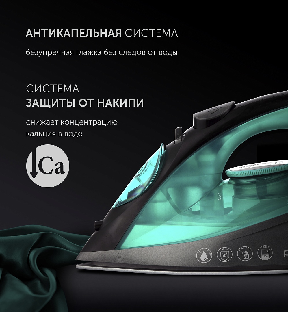 Антикапельная система.Мощность: 2400 Вт.Система равномерного распределения тепла SMART HEAT.Режимы работы:- сухое глажение;- отпаривание (50 г/мин);- интенсивная подача пара - "паровой удар" (145 г/мин);- вертикальное отпаривание.Система защиты от накипи.Функция самоочистки.Шарнирное вращение шнура.Объем резервуара для воды - 270 мл.