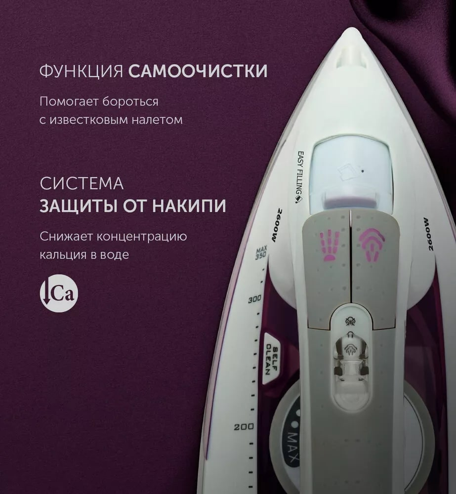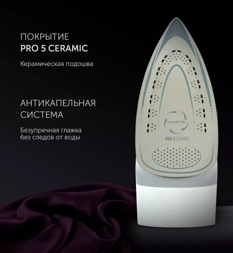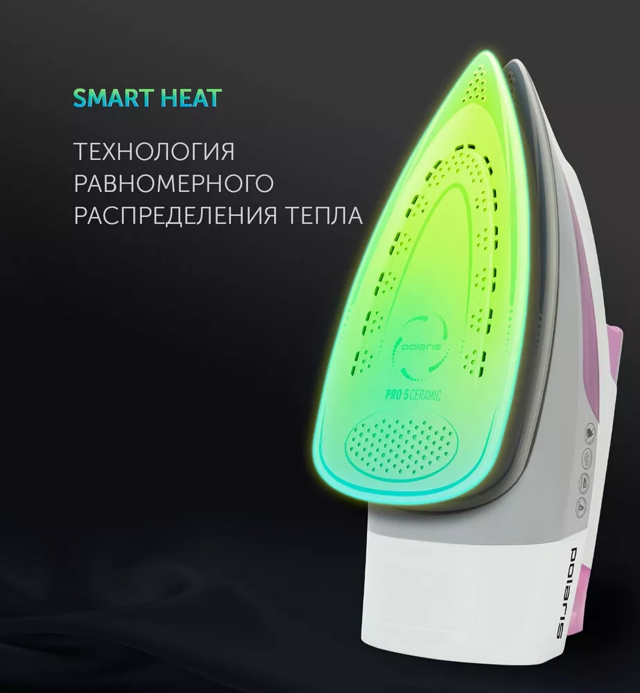 SMART HEAT – Технология равномерного распределения тепла по подошве утюга. Ультрастойкое керамическое покрытие PRO 5 Ceramic. Система автоматического отключения со звуковым оповещением.