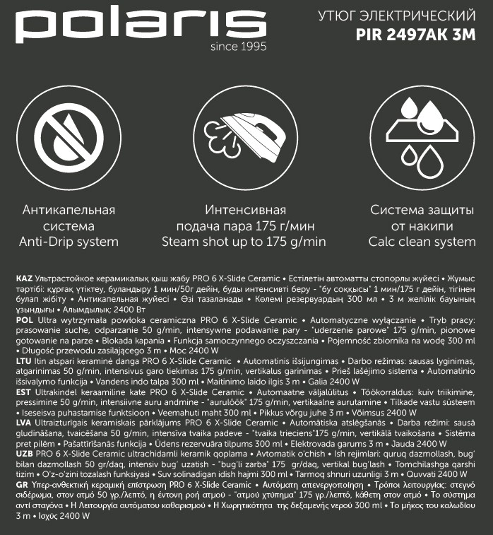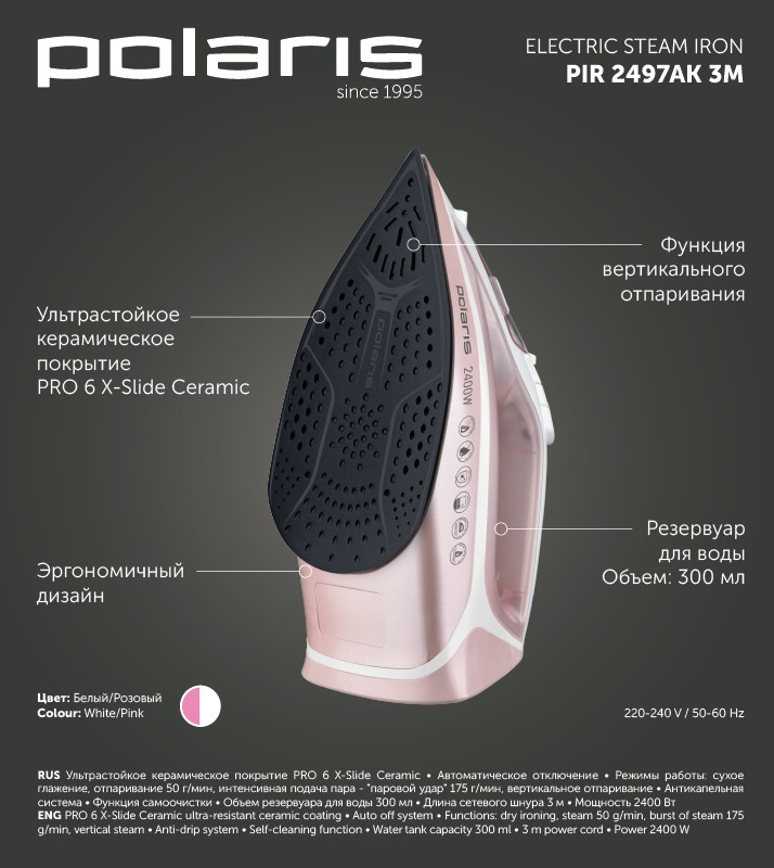 Ультрастойкое керамическое покрытие PRO 5 Ceramic.Smart Heat: Технология равномерного распределения тепла по подошве утюга.Система автоматического отключения. Режимы работы: - сухое глажение; - отпаривание (50г/мин); - интенсивная подача пара - паровой удар (175г/мин); - вертикальное отпаривание. Антикапельная система. Система защиты от накипи. Функция самоочистки. Объем резервуара для воды - 300мл. Длина сетевого шнура 3м. Мощность 2400Вт.