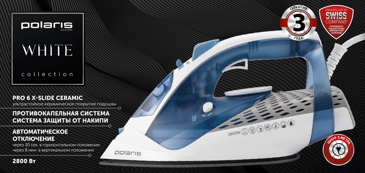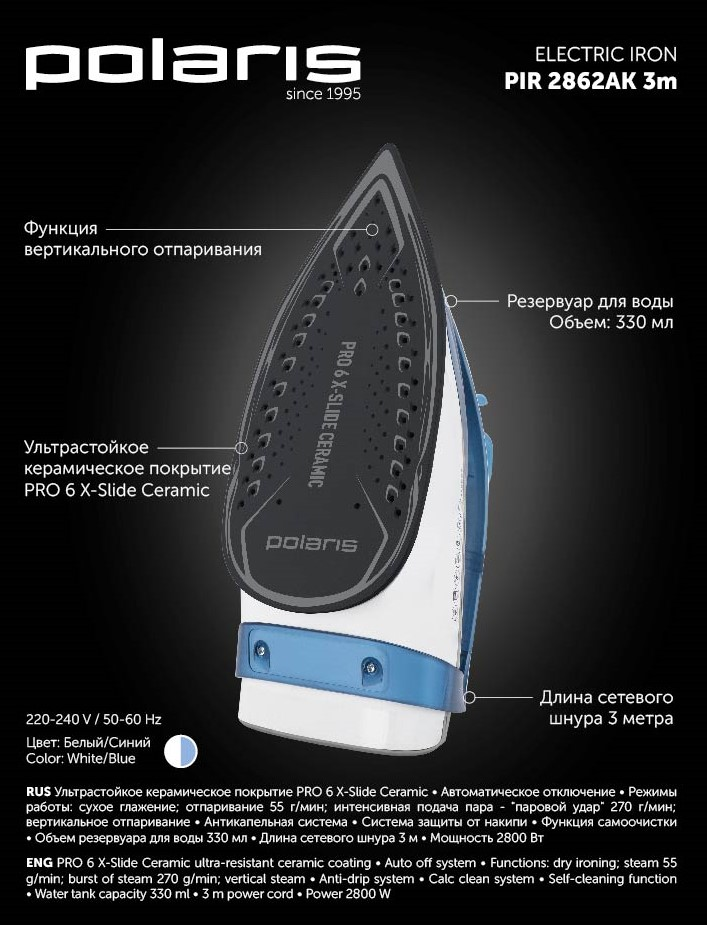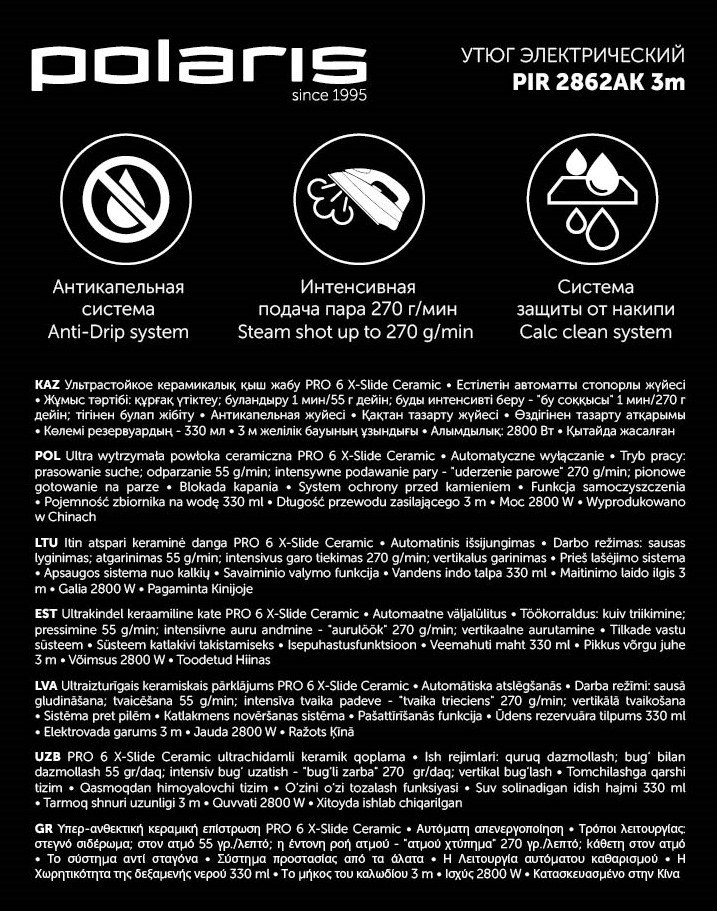Ультрастойкое керамическое покрытие PRO 6 X-Slide Ceramic.Smart Heat - Технология равномерного распределения тепла по подошве утюга.Система автоматического отключения.Мощность: 2800ВтРежимы работы:- сухое глажение;- постоянная подача пара (55г/мин);- интенсивная подача пара (270г/мин);- вертикальное отпаривание;Антикапельная система.Система защиты от накипи.Функция самоочистки.Длина сетевого шнура 3м.Объем резервуара для воды 330мл.