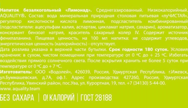Напиток Увинская Жемчужина Aquality Лимонад безалкогольный низкокалорийный среднегазированный, 1.5л