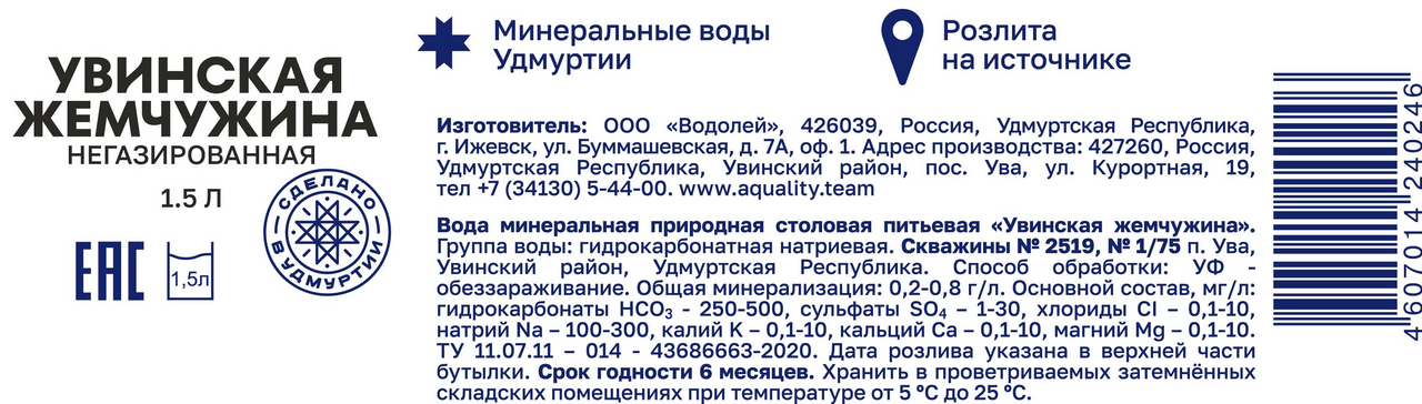 Вода Увинская Жемчужина минеральная природная столовая питьевая негазированная, 1.5л x 6 шт