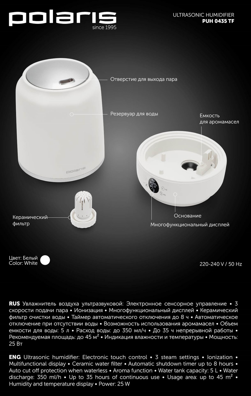 Многофункциональный LED дисплей.Ионизация.Резервуар для воды: 5л.3 скорости подачи пара.Встроенный ионизатор.Таймер автоотключения до 8 часов.Индикация влажности и температуры.Сенсорная панель управления.Керамический фильтр для очистки воды.Возможность использования аромамасел.Автоматическое отключение при отсутствии воды.До 35 часов непрерывной работы.Расход воды: 350мл/ч.Рекомендуемая площадь: до 45м2.Мощность: 25Вт.