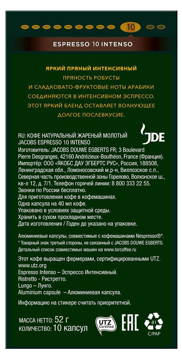 Кофе в капсулах Jacobs Espresso №10 Intenso для кофемашин Nespresso 10шт, 52г х 10 шт