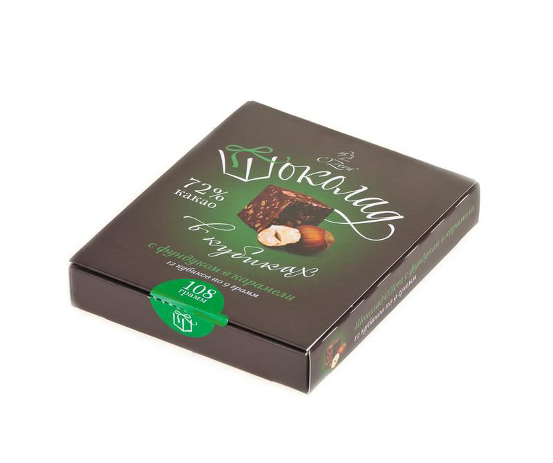 Шоколад молочный с фундуком в карамели в кубиках, 108г. 12 кубиков по 9г. Состав: какао тертое, сахар, какао-масло, молоко сухое цельное, орех фундук жареный, эмульгатор: лецитин, ароматизатор идентичный натуральному ''Ваниль''. Общее содержание сухого остатка какао не менее 37,5%. Содержание какао-продуктов не менее 38%. Сухой обезжиренный остаток какао не менее 7%. Сухой обезжиренный остаток молока не менее 14,6%. Молочный жир не менее 5%. Пищевая ценность на 100г продукта: белки 8г, жиры 38,5г, углеводы 50,4г. Энергетическая ценность: 558 ккал. Хранить при температуре от +5С до +22С и относительной влажности воздуха не более 70%. Не подвергать воздействию прямого солнечного света. Срок хранения: 12 месяцев.