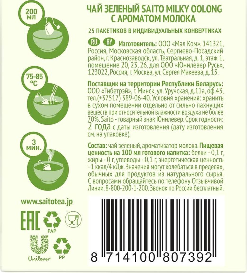 Чай в пакетиках Saito Milky Oolong зеленый, 25*1,5г