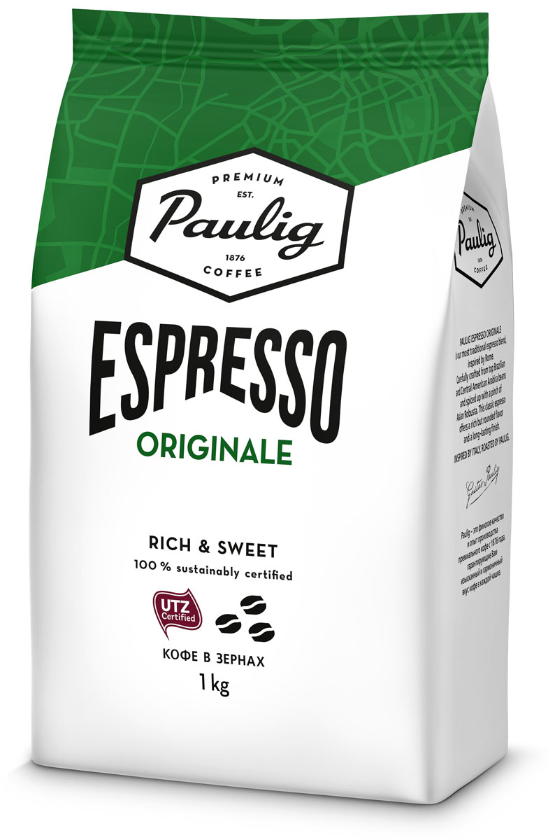 Кофе Паулиг эспрессо Originale в зернах 1кг. Кофе натуральный в зернах темной обжарки. Этот традиционно мягкий эспрессо, обжаренный в северо-итальянском стиле, дополняет щепотка робусты, придающая ему насыщенность и интенсивность. В 100мл готового кофе 0,7% кофеина.