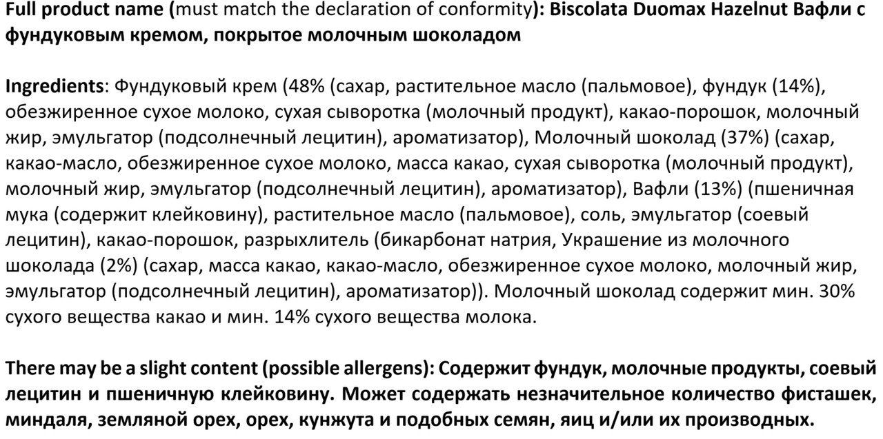 Фундуковый крем (сахар, растительное масло пальмовое, фундук, обезжиренное сухое молоко, сухая сыворотка молочный продукт, какао-порошок, молочный жир, эмульгатор подсолнечный лецитин, ароматизатор), Молочный (шоколад сахар, какао-масло, обезжиренное сухое молоко, масса какао, сухая сыворотка молочный продукт, молочный жир, эмульгатор подсолнечный лецитин, ароматизатор), Вафли (пшеничная мука содержит клейковину, растительное масло пальмовое, соль, эмульгатор соевый лецитин, какао-порошок, разрыхлитель бикарбонат натрия), Украшение из молочного шоколада (сахар, масса какао, какао-масло, обезжиренное сухое молоко, молочный жир, эмульгатор подсолнечный лецитин, ароматизатор).