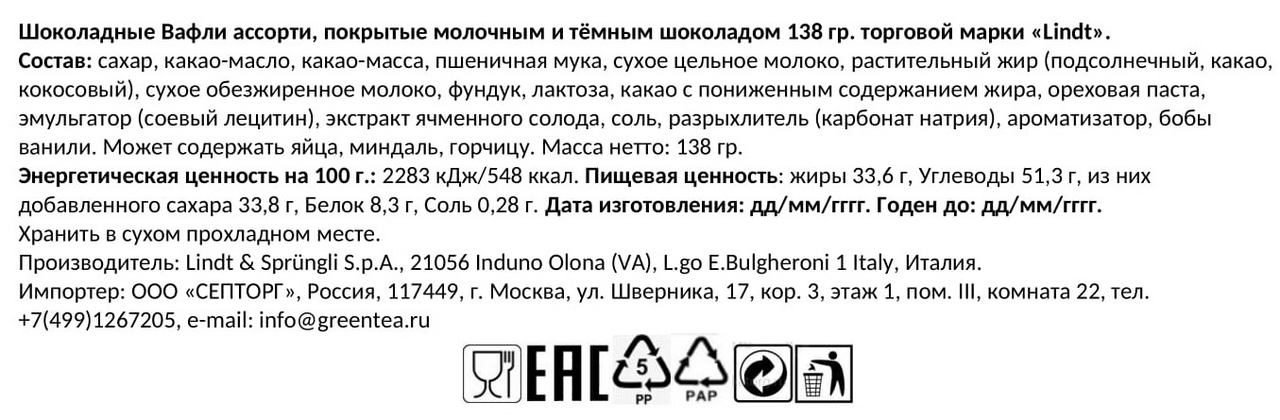 Насладитесь коллекцией восхитительных шоколадных вафель от мастера-шоколатье Lindt с разнообразными вкусами. Слои хрустящих шоколадных вафель с изысканным молочным, тёмным шоколадом и жареным фундуком. Идеально подходит для того, чтобы разделить драгоценные моменты вместе. Индивидуальная упаковка каждой конфеты.