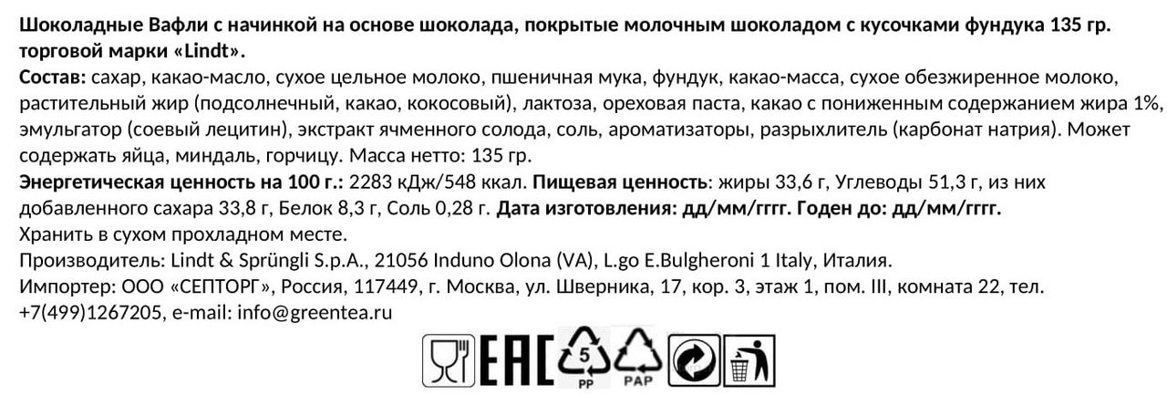 Вафли Lindt молочный шоколад и фундук, 135г
