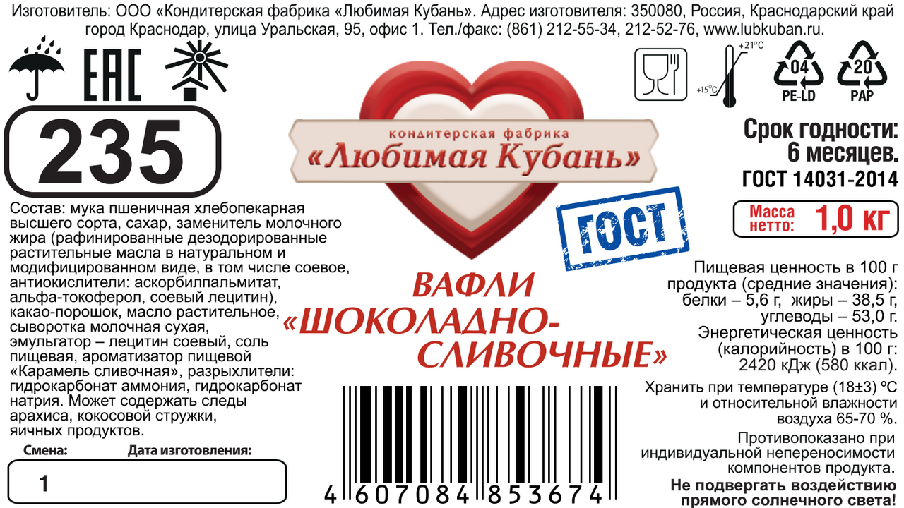 Вафли Любимая Кубань шоколадно-сливочные, 1кг