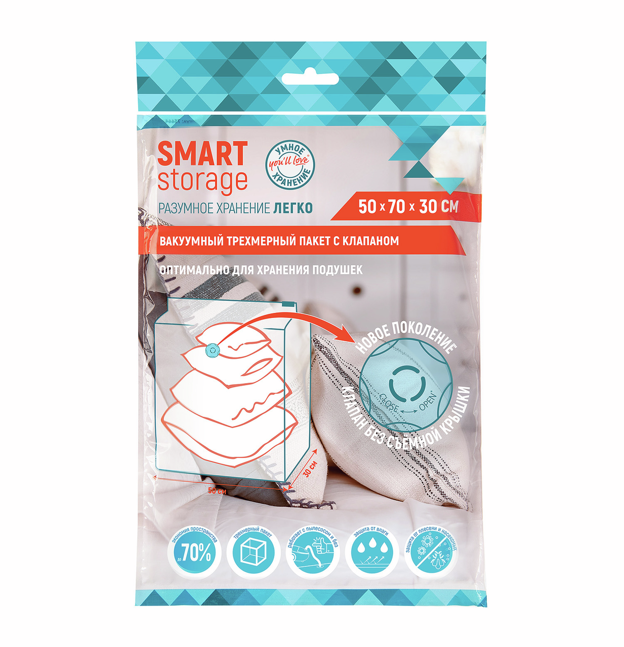 Пакет вакуумный You'll love трехмерный с клапаном, 50 x 70 x 30см - идеальное решение для компактного хранения вещей: сезонные вещи в межсезонье, редко используемые комплекты одеял и подушек. И даже компактная перевозка вещей во время путешествия. Экономия до 75% объёма. Пакет также защищает вещи от влаги и плесени, выцветания, пыли, запаха и насекомых. Наличие клапана позволяет быстро и легко упаковать вещи. Доступны 2 варианта использования: ручная и с помощью пылесоса.