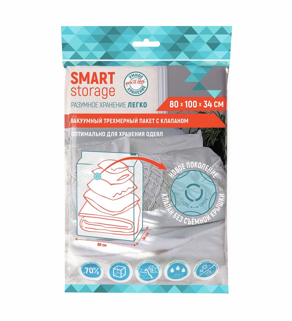 Пакет вакуумный You'll love трехмерный с клапаном, 80 x 100 x 34см - идеальное решение для компактного хранения вещей: сезонные вещи в межсезонье, редко используемые комплекты одеял и подушек. И даже компактная перевозка вещей во время путешествия. Экономия до 75% объёма. Пакет также защищает вещи от влаги и плесени, выцветания, пыли, запаха и насекомых. Наличие клапана позволяет быстро и легко упаковать вещи. Доступны 2 варианта использования: ручная и с помощью пылесоса.