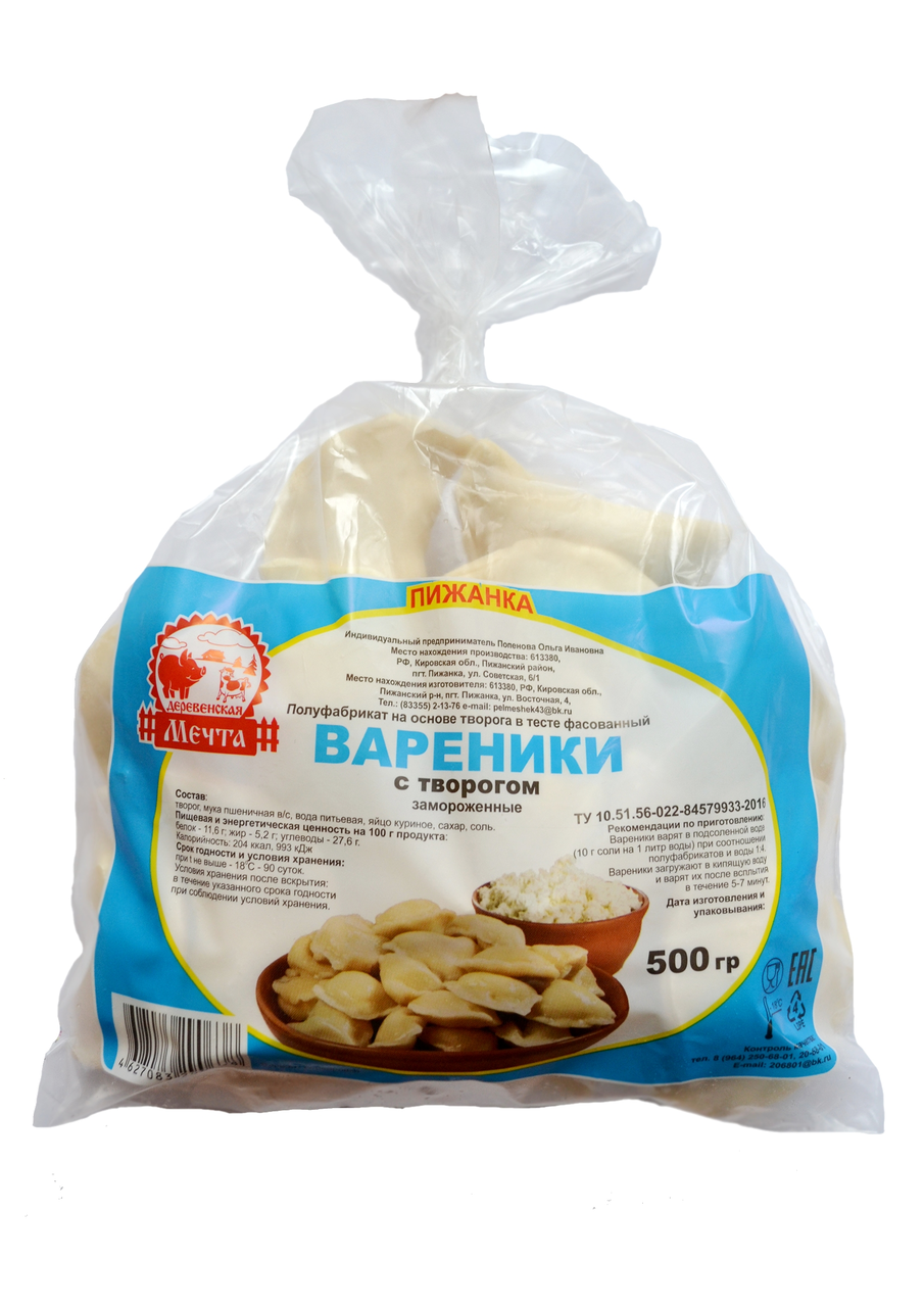 Вареники Деревенская Мечта с творогом замороженные производятся методом ручной лепки. Для изготовления продукции традиционно используются только натуральные ингредиенты. Вся выпускаемая продукция имеет санитарно-эпидемиологические заключения и сертификаты соответствия.