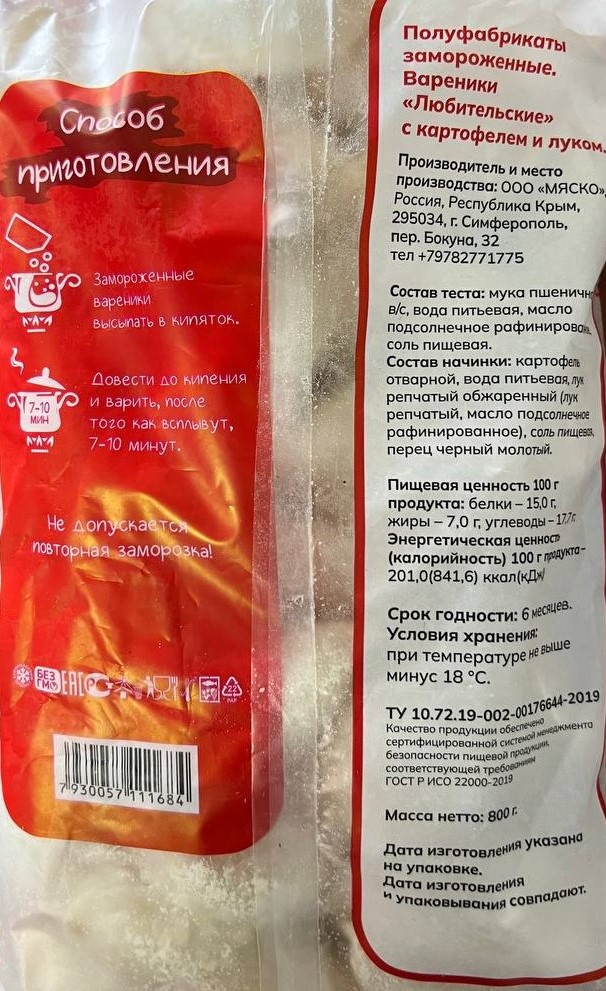 Вареники Мяско Любительские с картофелем и луком, 800г
