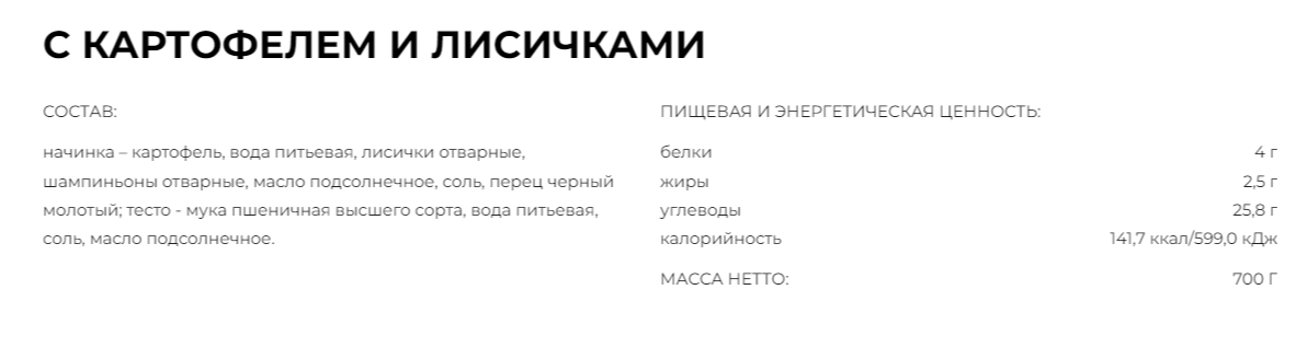 Начинка- картофель, вода питьевая, лисички отварные, шампиньоны отварные, масло подсолнечное, соль, перец черный молотый; тесто - мука пшеничная высшего сорта, вода питьевая, соль, масло подсолнечное.