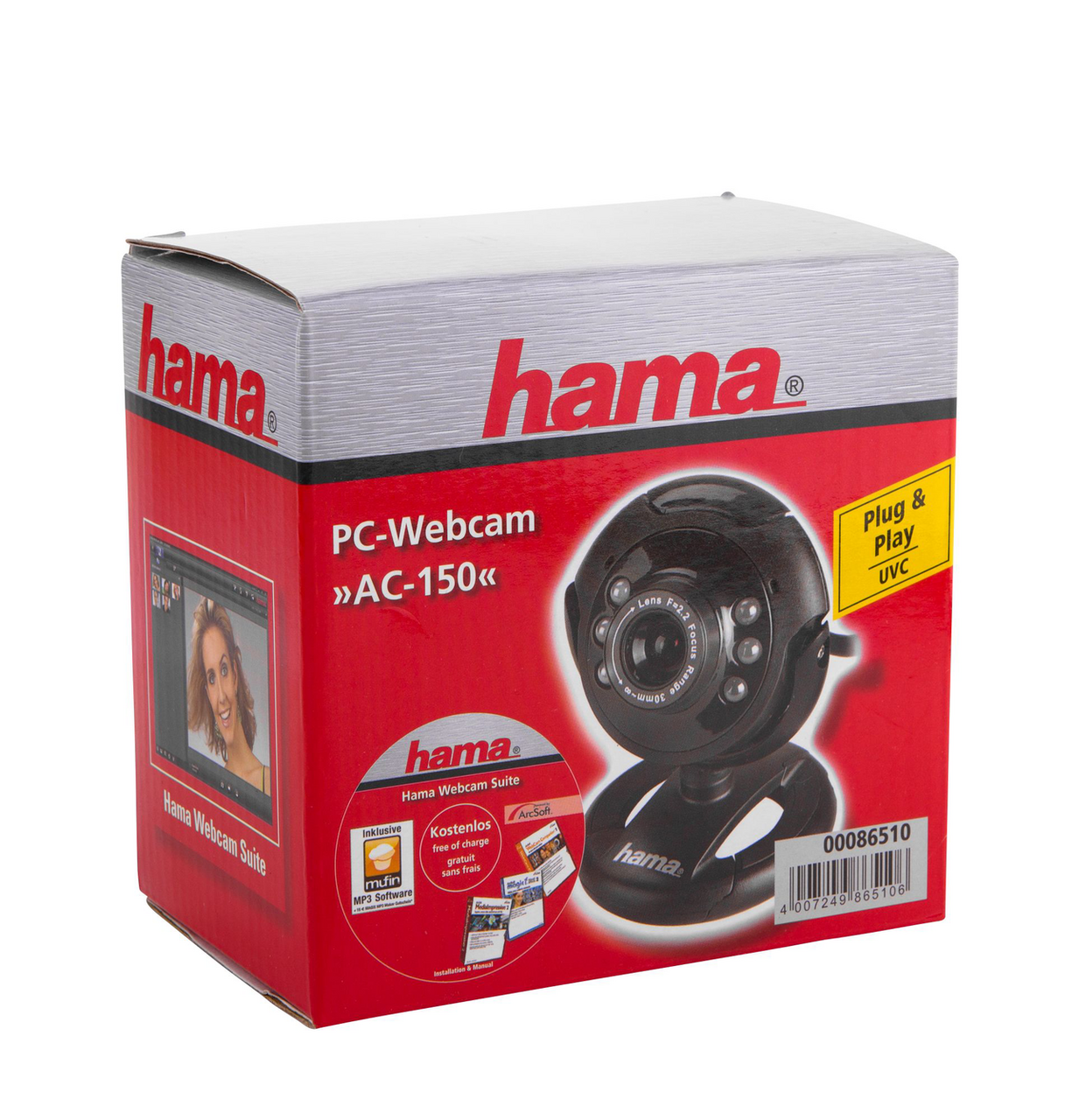 Hama AC-150, веб-камера с функцией отправки фото и видео по почте. Ножка камеры может использоваться как устойчивая основа или как зажим на экране TFT-монитора или ноутбу��а. Совместима с программами быстрой передачи сообщений, типа ICQ, MSN, Skype, Yahoo и т.д.