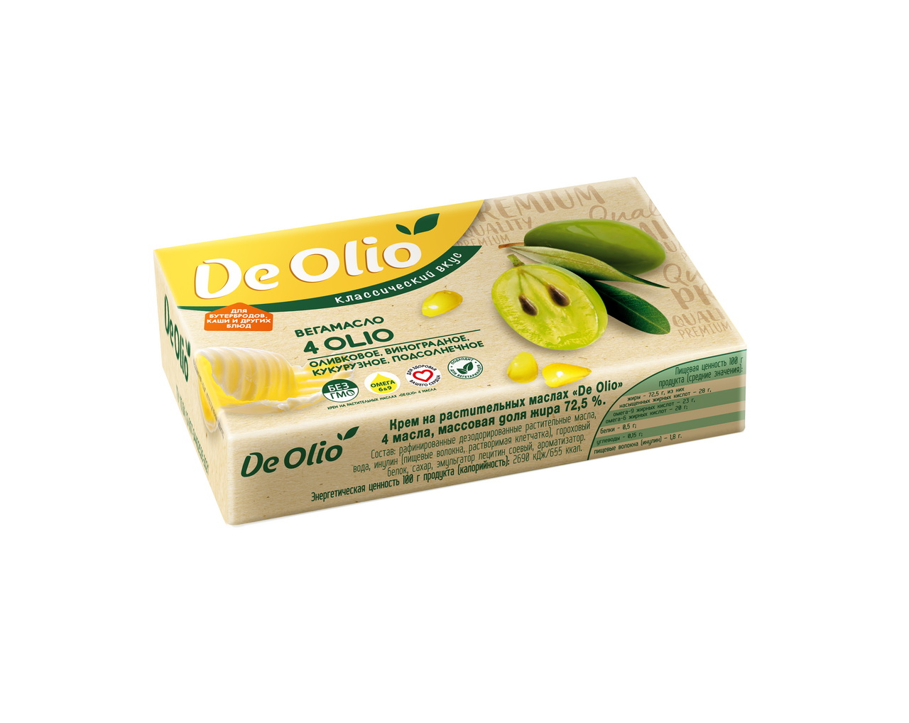 Вегамасло De Olio 4 Olio - уникальная новинка среди необычных вкусов линейки De Olio. Уникальность вегамасла De Olio 4 OLIO заключается в том, что оно обладает нежным, классическим и привычный для всех сливочным вкусом. Вегамасло De Olio обогащено полезными жирными кислотами - ОМЕГА 6-9, которые положительно влияют на функционирование всех органов в организме человека, в том числе способствуют поддержанию здоровья сердца. При этом в составе вегамасла отсутствуют продукты животного происхождения. Уникальный продукт, который обладает нежным, классическим и привычным для всех сливочным вкусом, но при этом не содержит в составе продуктов животного происхождения. Вегамасло De Olio обогащено полезными жирными кислотами — омега 6-9, которые положительно влияют на функционирование всех органов в организме человека, в том числе способствуют поддержанию здоровья сердца. De Olio 4 масла - идеальный продукт для тех, кто является сторонником здорового питания или по каким-либо причинам придерживается исключительно растительной диеты.