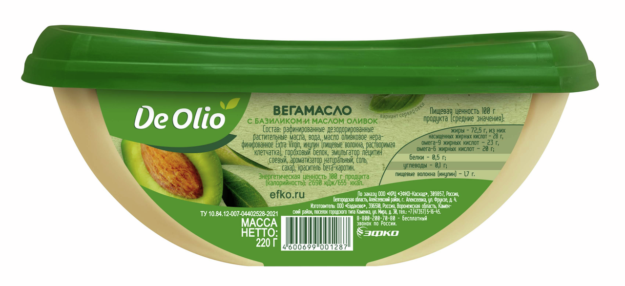 Вегамасло De Olio с базиликом и маслом оливок 72.5%, 220г