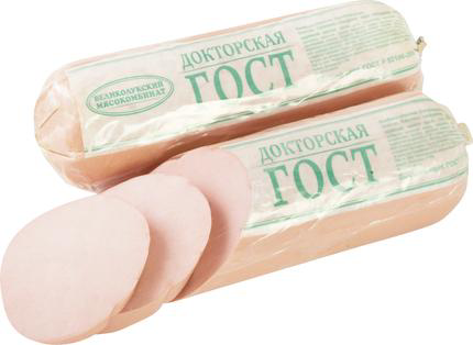 Колбаса Великолукский Докторская ГОСТ – качественный мясной продукт из свинины и говядины. Изделие не содержит консервантов и синтетических красителей и отличается в меру соленым приятным вкусом. Колбаса подойдет как для ежедневных завтраков и обедов, так и для украшения праздничного стола. Мясной продукт имеет упругую консистенцию, легко режется тонкими ломтиками.