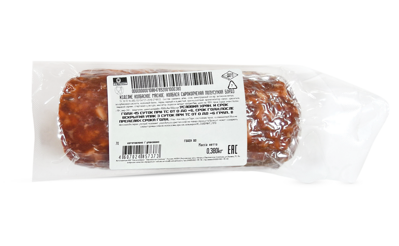 Колбаса Велком Бордо сырокопченая, 380 г станет украшением праздничной нарезки и может быть использована для бутербродов и салатов. Ее готовят по эксклюзивной рецептуре из свинины и шпика с добавлением черного и душистого перца и мускатного ореха. Специи придают продукту пикантность и оригинальность. Бордовый цвет мяса на срезе намекает, что колбаса не зря получила свое название. В массе фарша просматриваются мелкие вкрапления белого сала, которое делает текстуру маслянистой и сочной. При этом колбаса не очень жирная, у нее гармоничный мясной вкус с легкими пряными нотками и умеренной соленостью. Ее можно порезать тонкими ломтиками и красиво разложить на хлебе или батоне, тостах или зерновых хлебцах, дополнив кусочками овощей, оливками, маслинами и зеленью. В салатах ароматный сырокопченый деликатес играет главную роли и хорошо сочетается с горошком, кукурузой, огурчиками, консервированной фасолью, листьями салата, отварными яйцами и другими ингредиентами — вариантов очень много. Колбаса выпускается мясокомбинатом Велком, который принципиально отказался от применения ГМО-компонентов и заменителей. Производитель использует технологию натурального копчения с помощью древесного дымка и придерживается ГОСТов. Приобрести колбасу Велком Бордо сырокопченую, 380 г можно в торговом центре METRO.