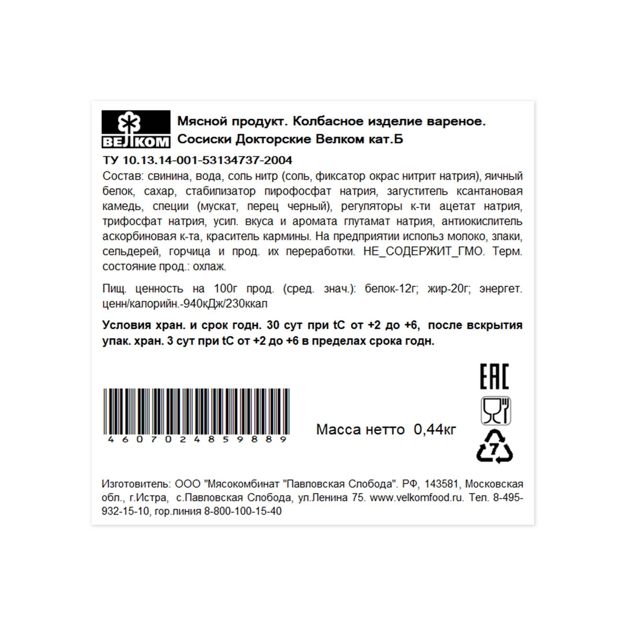 Сосиски Велком Докторские в вакууме, 440 г обладают вкусом, знакомым с детства. Залогом высокого качества продукта является использование натуральных ингредиентов и традиционной рецептуры. Колбасные изделия отличаются насыщенным мясным вкусом и нежной консистенцией, поэтому отлично подойдут для разнообразия рациона вашей семьи. Докторские сосиски дополняются большим ассортиментов сытных гарниров и соусов. Вакуумная упаковка предотвращает проникновение воздуха, тем самым надежно сохраняет свежесть.