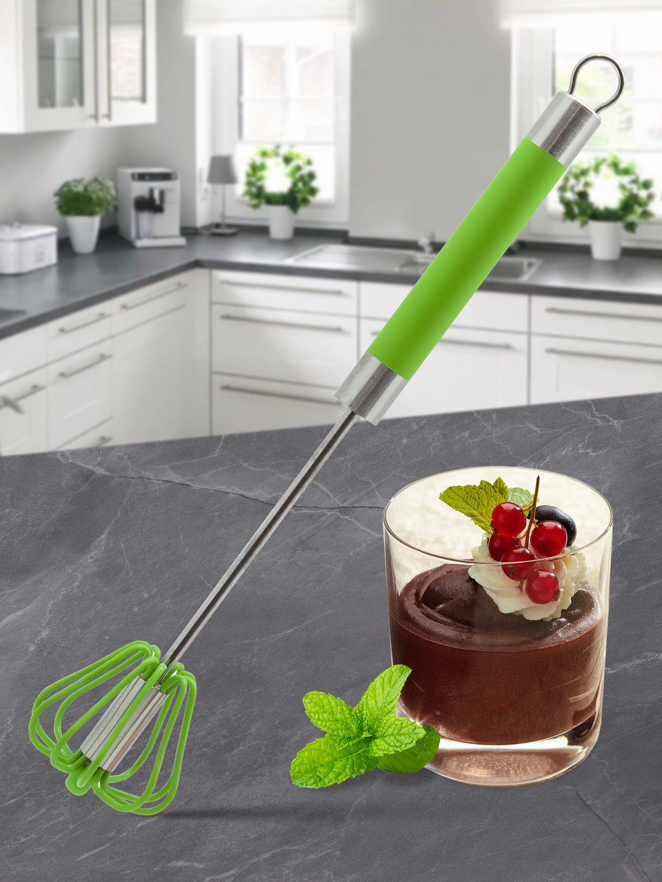 Венчик Твистер работает по принципу юла-волчок: нажимай и взбивай! Нажимаете на ручку, и взбивание молока, сливок, соусов, майонеза, коктейлей, муссов или омлета произойдёт моментально. Силиконовое покрытие не царапает посуду.