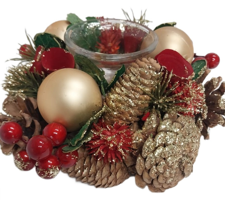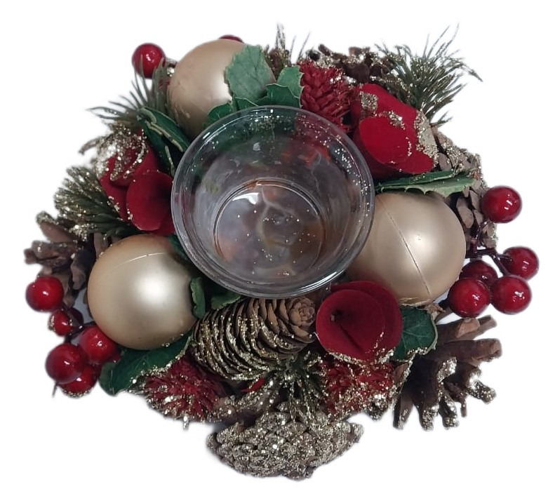 Венок-подсвечник красно-зеленый, 19см предназначен для украшения помещений к праздникам. В центре венка из зеленых веток ели размещена прозрачная колба для установки свечи совместимого диаметра. Отличается устойчивостью на ровной поверхности. Станет оригинальным дополнением праздничного стола.