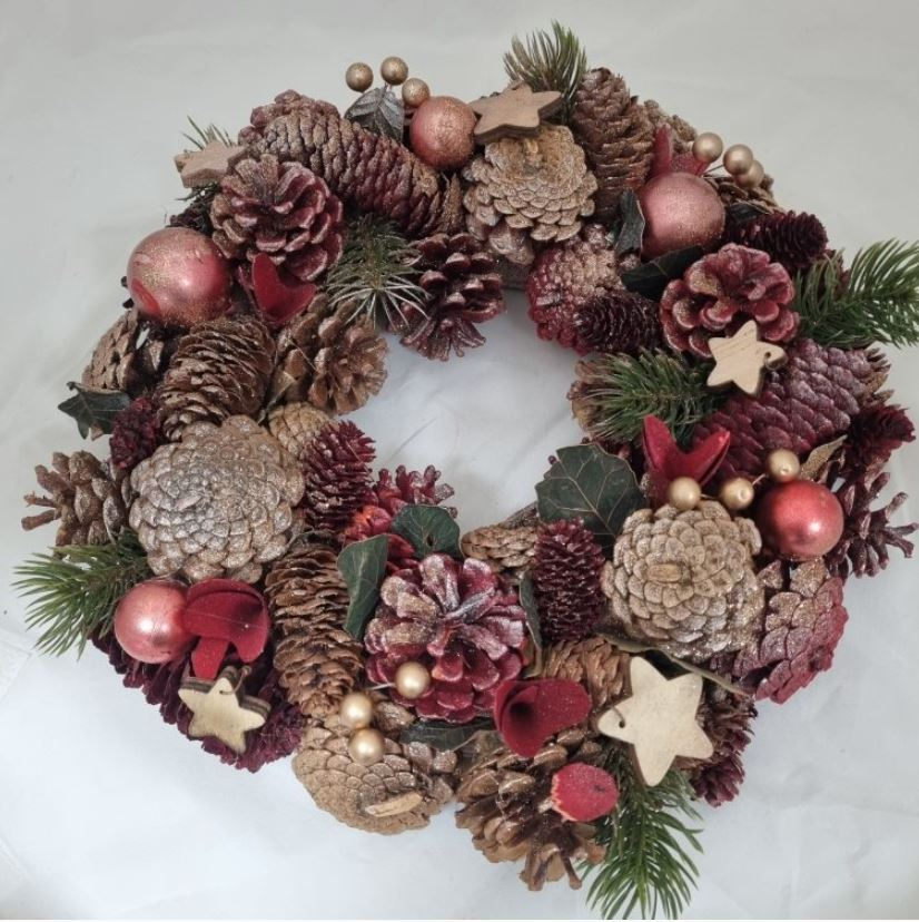 Венок из натуральных материалов , шишки покрыты инием, красные шарики, размер изделия, см: 33,5*33,5*8,5