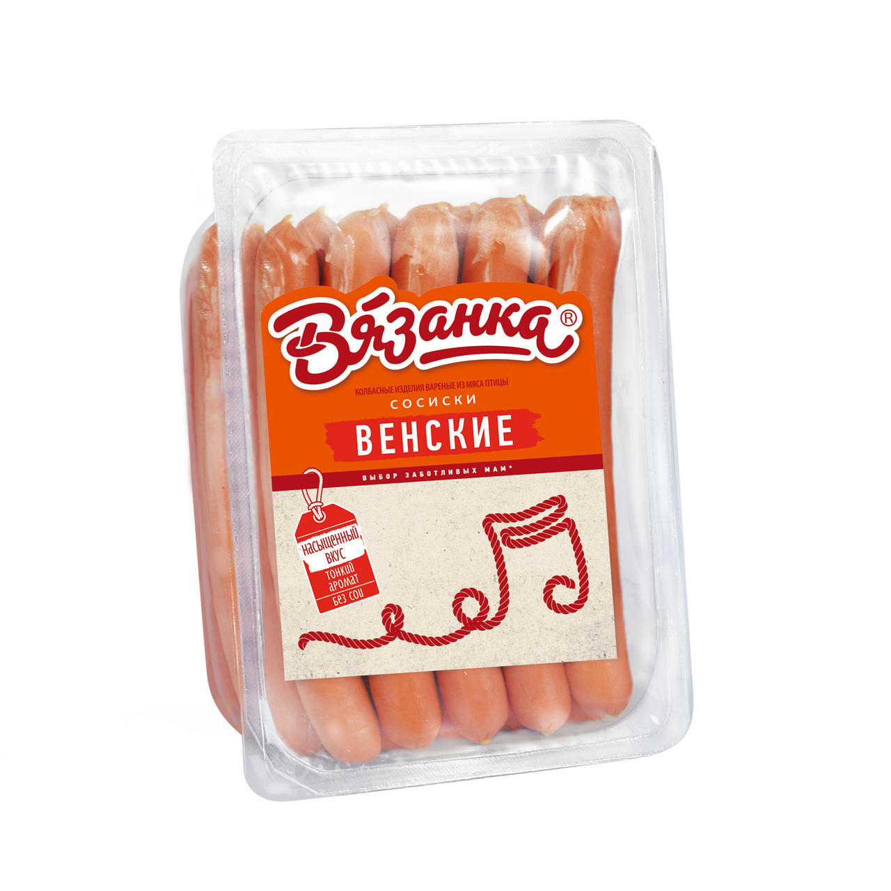 Сосиски Вязанка Венские, 500г – это аппетитный мясной продукт, который содержит в себе натуральные ингредиенты. Он обладает насыщенным мясным вкусом, сочной структурой и нежным ароматом копчения. Для приготовления использовано отборное натуральное мясо. При необходимости, сосиски можно легко очистить от оболочки. Они достаточно крупные, поэтому одной вполне достаточно для того, чтобы утолить чувство голода взрослому человеку. Их можно отварить, запечь, приготовить в тесте в духовке, благодаря чему они становятся более сочными и ароматными. Они находятся в яркой оранжевой упаковке герметично запечатанной. Этот продукт рекомендован, в том числе, и для детского питания. В его состав не входит соя. Снизу на упаковке указан подробный состав, условия хранения и другая важная информация. Приобрести сосиски Вязанка Венские, 500г можно в торговом центре METRO.Бренд Вязанка специализируется на производстве колбасных изделий для всей семьи. Он дважды получал премию Марка №1 в России в категории Мясная гастрономия. Продукцию компании отличают нежные, сбалансированные вкусы без обилия специй и остроты. Благодаря этому колбасы, сосиски, наггетсы Вязанки пользуются популярностью у всех членов семьи.