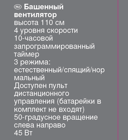 Низкий уровень шума делает его идеальным для использования в спальне или офисе, тихая работа устройства, позволяющая использовать его даже в ночное время без дискомфорта для окружающих. Высота 110см, 3 скорости, 10-часовой таймер, 70-градусное вращение, мощность 45Вт.