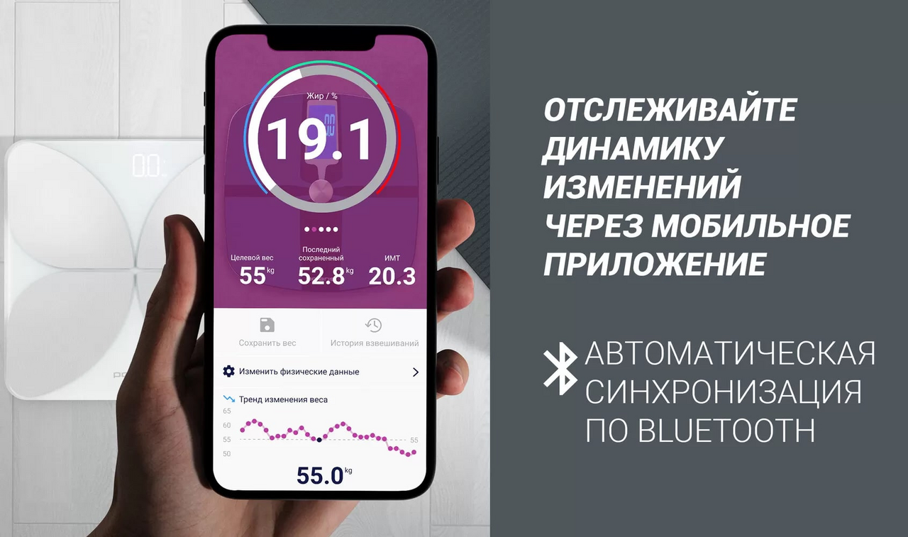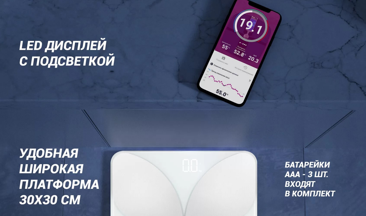 Отличаются высокой точностью, стильным дизайном и широким функционалом. Весы легко подключаются к телефону без дополнительного оборудования. Подключив весы к телефону, вы можете измерить не только свой вес, но и индекс массы тела, массу жира, мускулов, воды и костей (биоимпедансный анализ). В приложении также ведется история изменения массы тела. Историю изменения веса могут вести до 20 пользователей. Весы изготовлены из прочного закаленного стекла. Точность измерения веса достигается с помощью устойчивых прорезиненных ножек. Максимальный вес 200кг. Батарейки входят в комплект.