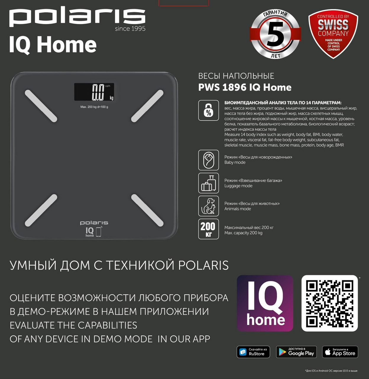 Отслеживайте динамику изменений через мобильное приложение IQ Home. Объем памяти на 20 пользователей. Сенсорная система для максимально точного измерения веса. Удобная широкая платформа (30х30см). Измерение процентного содержания жировой, мышечной, костной массы и воды в организме. Расчет индекса массы тела BMI. Автоматическая синхронизация с мобильным устройствами на базе Android и iOS посредством Bluetooth. ЖК-дисплей с подсветкой. Автоматическое включение и отключение. Индикация работы батареек. Индикация превышения максимального веса. Питание: 2 х 1,5V AAA (входят в комплект). Максимальный вес: 200кг. Цена деления: 0,1кг.