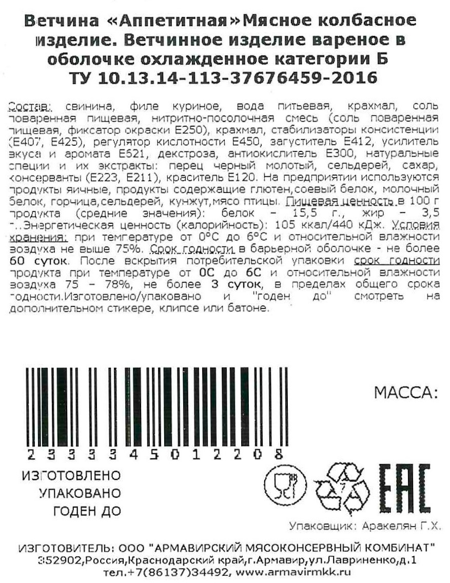 Ветчина Армавирский МК Аппетитная вареная, ~1.2кг