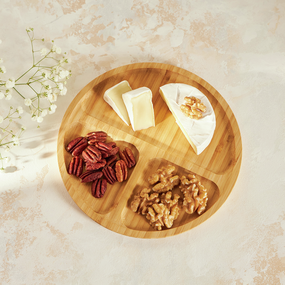 Изделие станет стильным и уютным элементом кухни и незаменимым аксессуаром для сервировки стола. Изготовлена из бамбука в цвете бамбук. Это стильное и практичное решение для сервировки стола. Изготовлена из экологически чистого материала - бамбука, который обладает высокой прочностью и долговечностью. Имеет компактный размер. Благодаря трем секциям на неё можно уместить несколько разных блюд, не смешивая их друг с другом. Круглая форма придает менажнице элегантный и современный вид. Идеально подходит для использования на любых торжественных мероприятиях или просто на повседневном ужине с семьей и друзьями. Также может служить отличным подарком для любителей красивой и функциональной посуды.