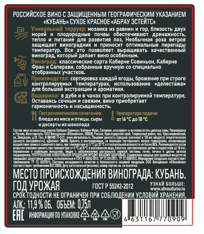 Вино из винограда сортов Каберне Совиньон, Каберне Фран и Саперави, консервант и антиокислитель диоксид серы.